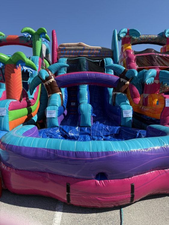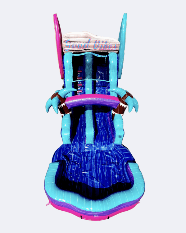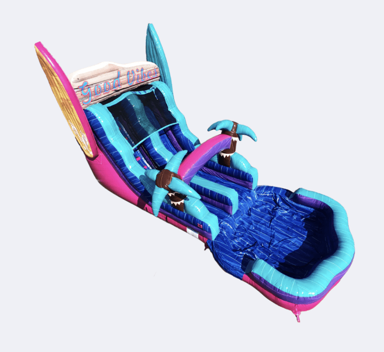 Our 17ft Good Vibes Water Slide brings the color and the fun to any party! Bright, eye-catching colors, fast lanes, sturdy handholds for easy climbing, and built-in safety netting/mesh make it a perfect choice for all ages. Keep the good vibes rolling all day long with this crowd-favorite slide!
