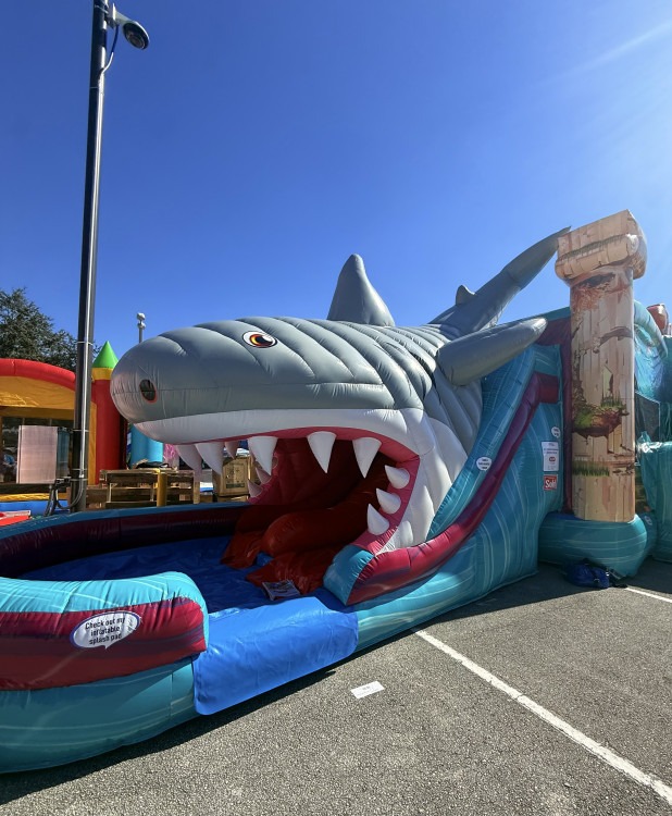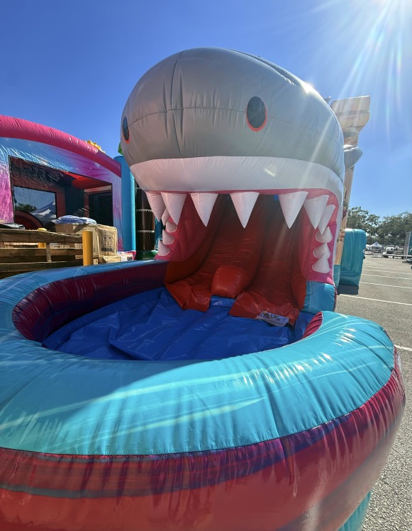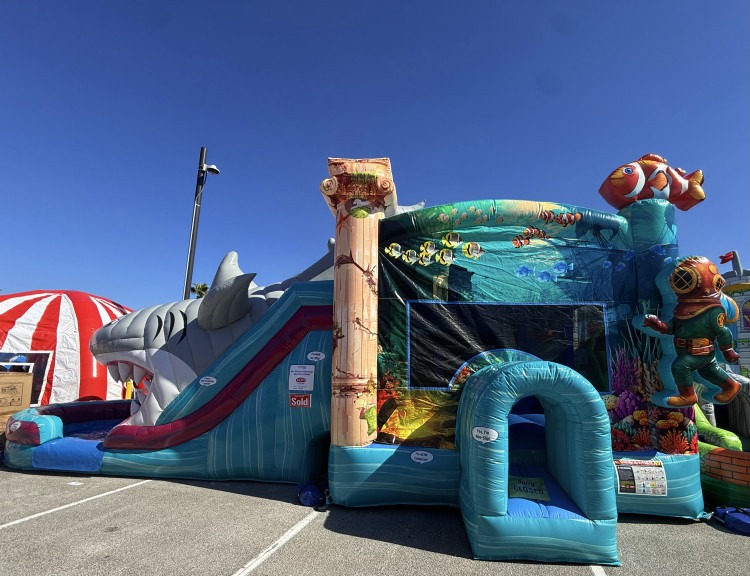 5-in-1 Atlantis Underwater Adventure Combo Dual Lane. This inflatable features includes an indoor basketball court, 2 rock-climbing wall that lead to the dual slides and an inflated pool area. Riders can climb, bounce, play basketball and race through the inflatable before finishing in the pool for a splash of fun. FOR WET USE